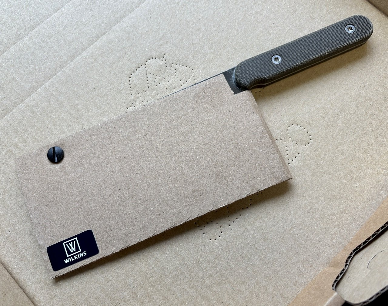 The (semi) Production Snack Chopper, full flat ground from 2.5mm Sandvik 14C28N Stainless steel. The blades have a machine satin finish. The Snack Chopper features full tang construction and grips of Black Textured G10. The grips are securely attached with a 3mm concealed pin, twin brass threaded inserts and M4 stainless Torx screws. The cutting edge isn't straight but rather slightly curved toward the tip to allow you to rock the knife on the cutting board.